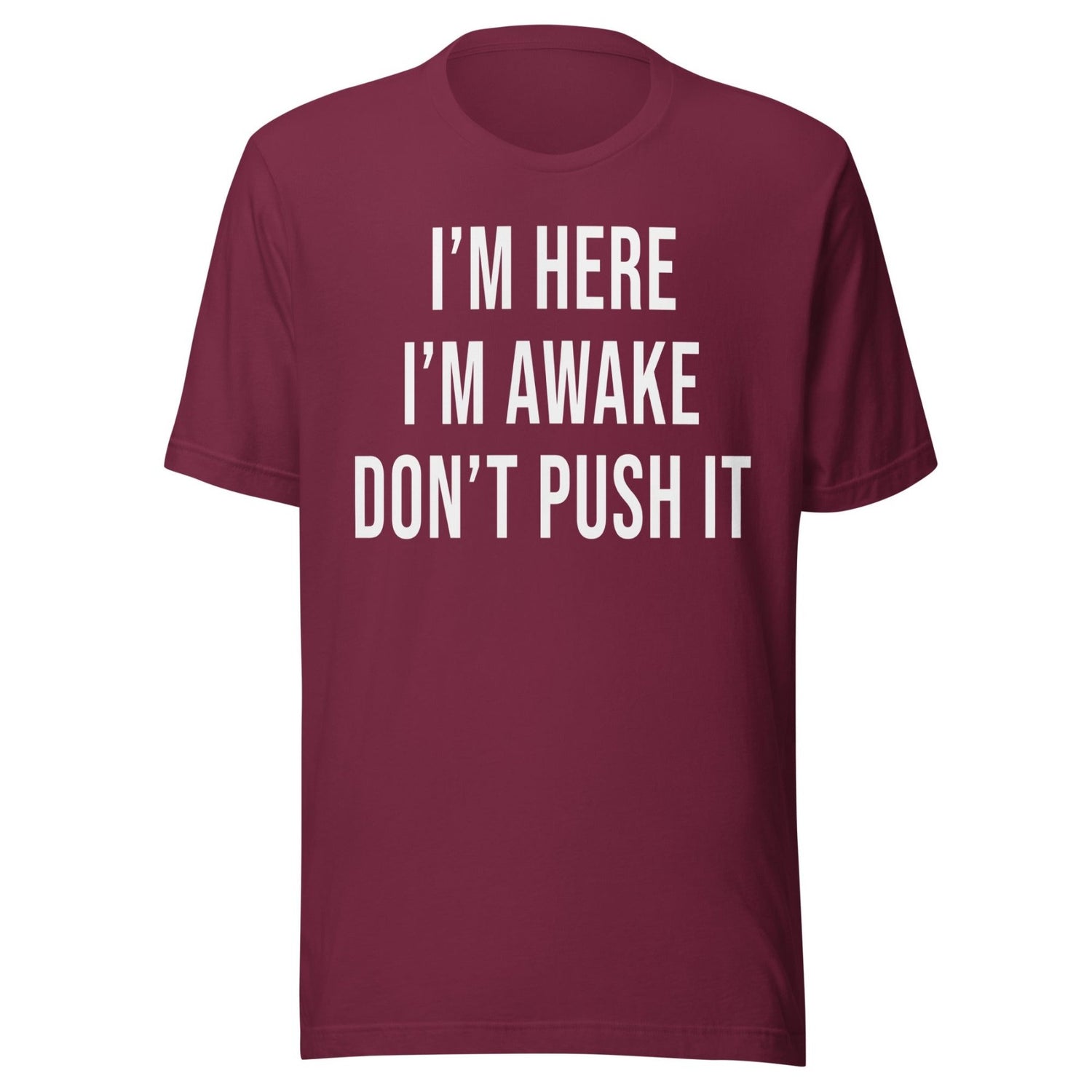 Introducing our I'm Here I'm Awake Don't Push It Shirt - perfect for those who love being pestered. Show that you're present and alert with this bold statement shirt. Guaranteed to keep others at bay, so you can enjoy peace and quiet.