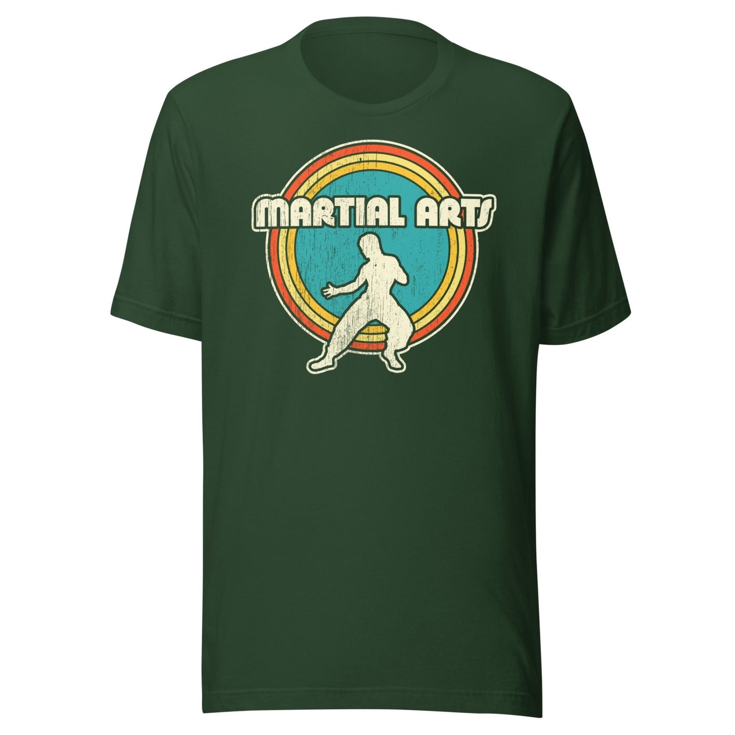 A super vintage and retro multi-colored circle design with heavy distressing to give the appearance of age and wear, even though it is 100% brand new and in perfect condition. Very cool! Paying homage to the glorious 70s and 80s when martial arts movies were good and Bruce Lee was still kicking ass.
