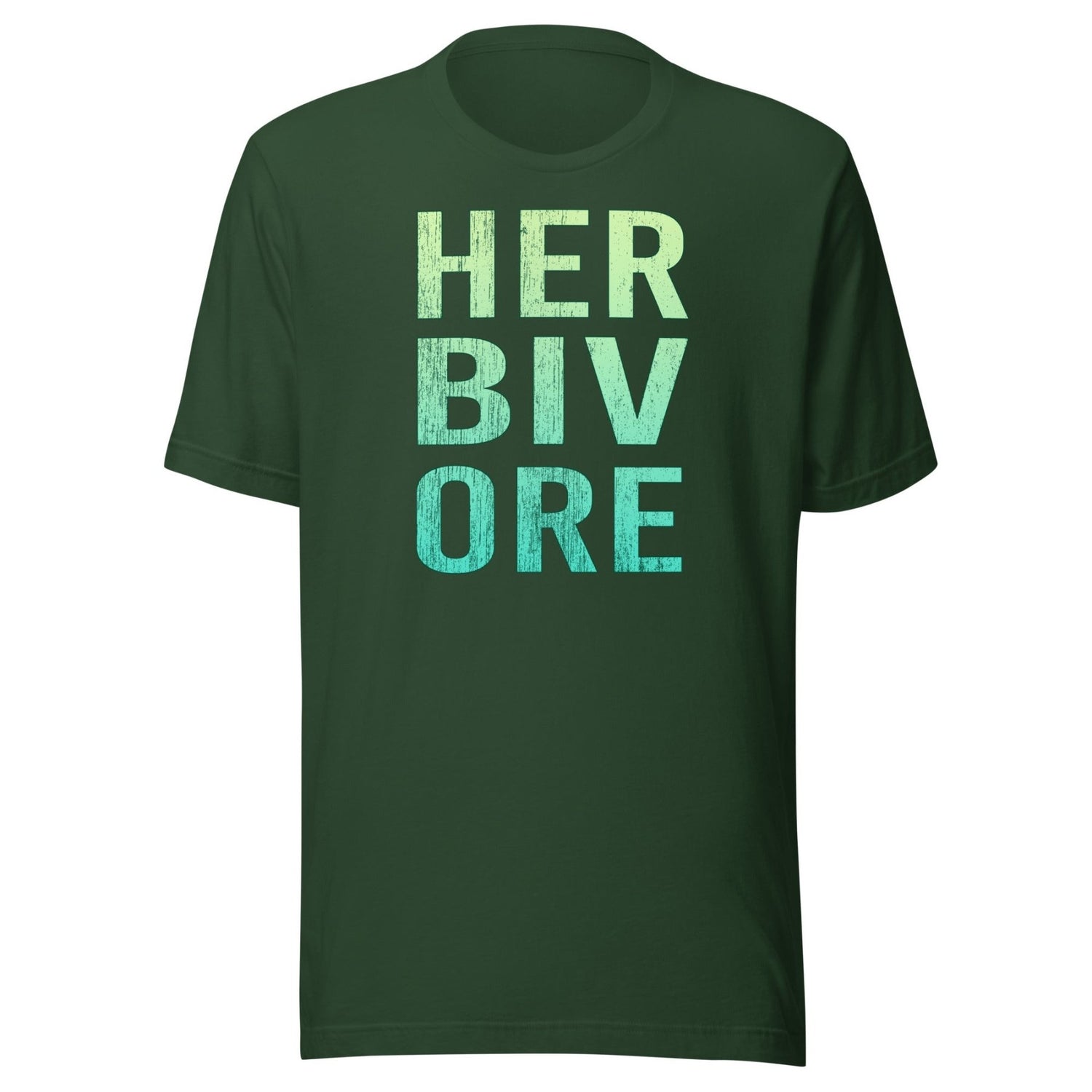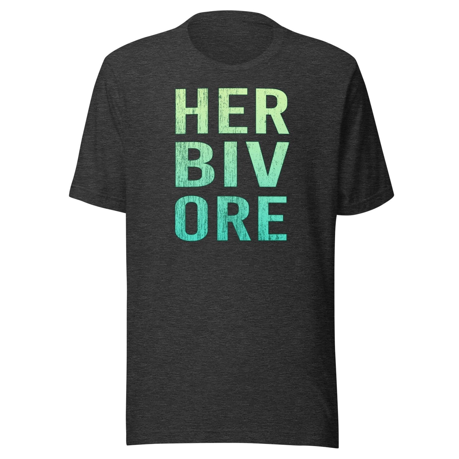A super cool distressed green gradient eye chart that spells out the word HERBIVORE. An awesome tee for pro-vegan people on the plant-based whole foods diet.