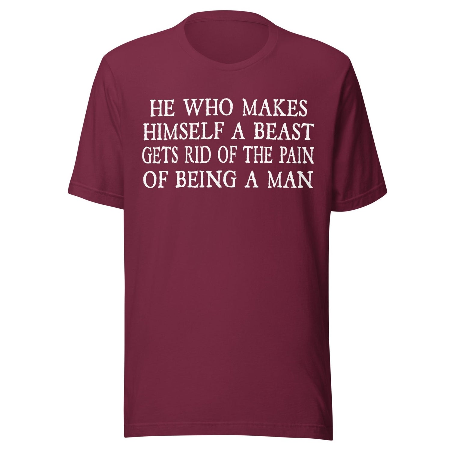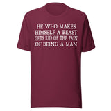 Embrace your inner beast and cast away the pain of your humanity with our 'He Who Makes A Beast Of Himself Gets Rid Of The Pain Of Being a Man' shirt. With this powerful message, let go of societal expectations and embrace your true self. Find liberation in the wild.