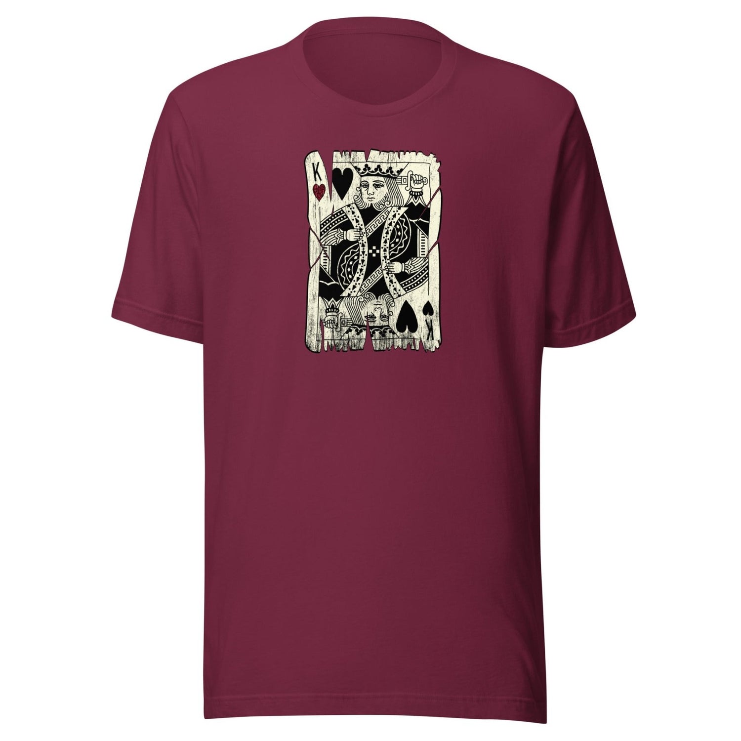 A cool graphic tee featuring the English King of Hearts, sometimes referred to as the "suicide king." This card has been through a lot of poker games. The king is so tired and worn out that he only has one red heart left. The rest are black.
